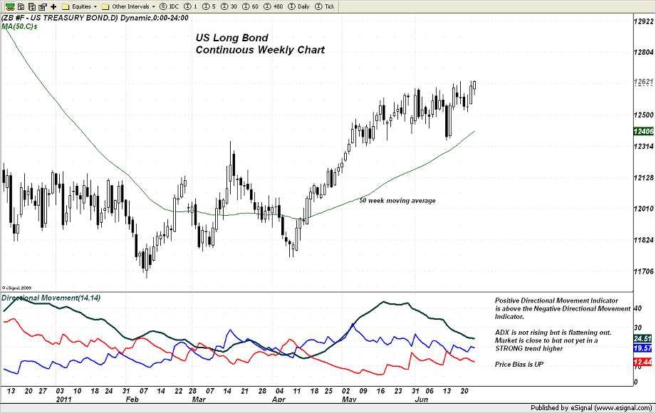 If you will also note the particular technical indicator I have chosen to overlay on this price chart, the Directional Movement Indicator, you will see that the solid black line, or ADX, which began rising in July 2010, and accompanied the rise in the index all through February of this year (indicating a STRONG TREND HIGHER) turned down at that point indicating a pause in the ongoing higher trend. The blue line or Positive Directional movement indicator has been trending lower since December of last year while the Negative Directional Movement Indicator, or red line, has begun trending higher since February of this year. What this indicator is telling us is the trend toward higher commodity prices is over for the time being. The upside crossover of the Negative Directional Indicator ABOVE the Positive Directional Indicator, is BEARISH. While the index has not yet fallen through the lower of the two red support lines on the chart, it is signaling that weakness in the sector lies ahead.