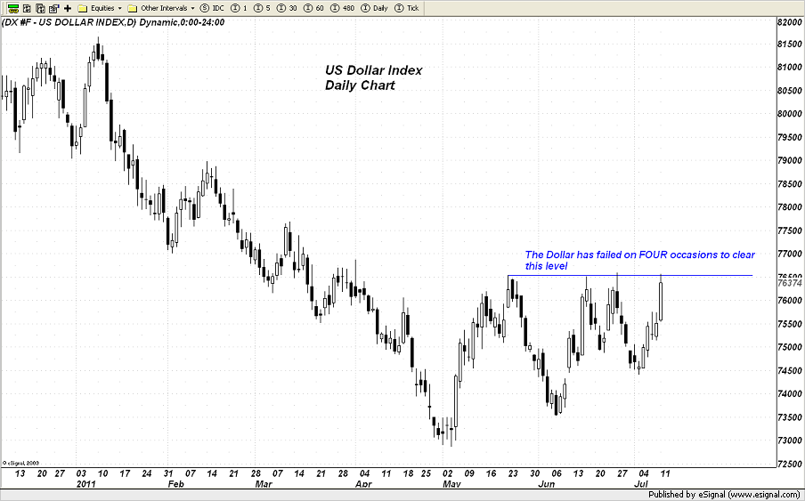 The US Dollar was sharply higher today (Monday) on a safe haven bid but was once again unable to successfully clear overhead resistance centered near the 76.50 level on the USDX chart. This level is taking on increasing significance therefore as sellers have been able to hold it from breaking through even when volume has been good. IF, and this is a big "IF", the Dollar can punch through this level and hold its gains, it will have managed a breakout to the upside and should be able to garner enough buying momentum from trapped shorts to initially take it up towards 77.50 - 78.00. Should it do so, we will want to see how gold responds to any such event. If gold does what it did today and ignores Dollar strength, the Gold bears are in trouble.