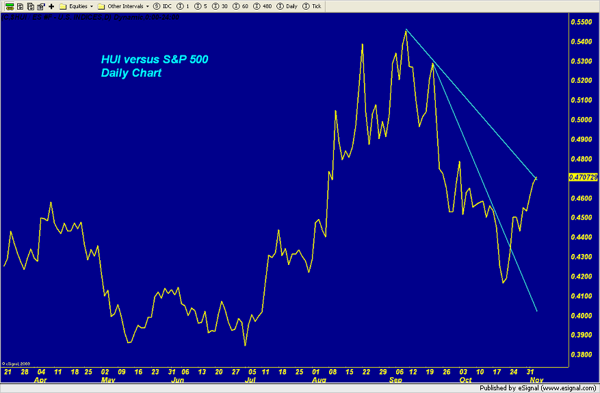 The Metals: Gold waffled near unchanged in Asia and London, but it then jumped higher in New York and ended near its late session high of $1767.55 with a gain of 2.14%. Silver rose to as high as $34.859 and ended with a gain of 1.56%. Euro gold climbed to about €1277, platinum rose $43.25 to $1635.75, and copper gained a few cents to about $3.59. Gold and silver equities rose about 3% by midafternoon and remained near that level for the rest of the day. The Economy: Report | For | Reading | Expected | Previous | Initial Claims | 10/29 | 397K | 401K | 406K | Productivity | Q3 | 3.1% | 2.8% | -0.1% | Unit Labor Costs | Q3 | -2.4% | -1.1% | 2.8% | Factory Orders | Sep | 0.3% | -0.2% | 0.1% | ISM Services | Oct | 52.9 | 53.8 | 53.0 |