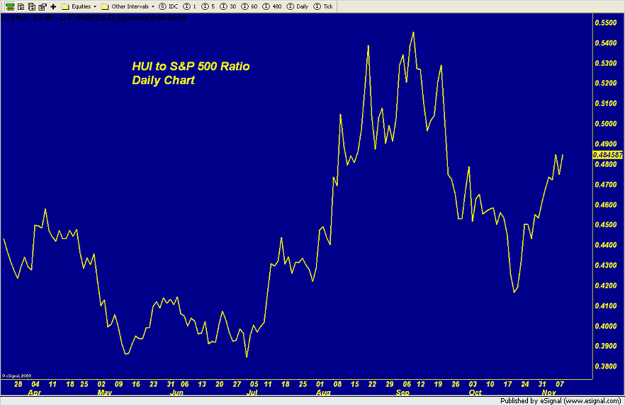Charts Courtesy of http://finance.yahoo.com/ Oil briefly turned higher after the Energy Information Administration reported that crude inventories fell 1.4 million barrels, gasoline inventories fell 2.1 million barrels, and distillates fell 6.0 million barrels, but it still ended lower on the day after a late session sell off hit nearly all markets. The U.S. dollar index and treasuries rose while the Dow, Nasdaq, and S&P fell almost 4% on renewed worries about Europe’s debt problems as Italian bond yields spiked above 7%. While markets were calmed yesterday when Berlusconi announced that he would resign once a budget is passed, doubts arose today as to whether or not he would actually do so, and the market is now seeking an immediate resignation. Among the big names making news in the market Friday were Olympus, Goldman Sachs, GM, Activision, Adobe, HSBC, and Toyota. The Commentary: “Traders/investors looking to take a defensive posture in the equity markets continue to see the mining sector as a place in which to find some temporary shelter. While the HUI is getting pulled lower today alongside the entirety of the US equity markets, the sector is holding in relation to the broader market.